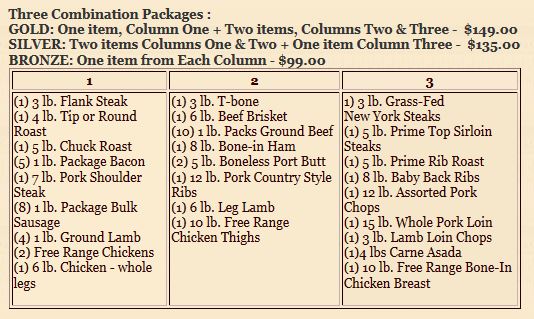 Even before we announced our Meat packages on Facebook, they were becoming a popular item from our web site. The packages have built in flexibility so you choose three price options and different meats within each one. The grid of meat choices shown below is the same grid on our web site page.